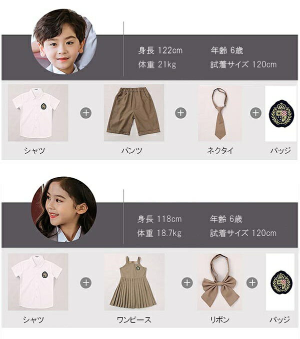 セット内容 ✽.*꙳ 学生服男の子:シャツ/パンツ/ネクタイ女の子:シャツ/ワンピース/リボン「ジャケット」オプション:別途+2650円「記載のないアクセサリー、小物等は付属しません」 素材 ✽.*꙳ コットン カラー ✽.*꙳ ベージュ サイズ (cm) ✽.*꙳ 100/バスト71 袖丈13 着丈43 パンツ丈31110/バスト74 袖丈13 着丈46 パンツ丈33120/バスト77 袖丈14 着丈49 パンツ丈35130/バスト80 袖丈15 着丈52 パンツ丈37140/バスト86 袖丈16 着丈55 パンツ丈39150/バスト92 袖丈17 着丈61 パンツ丈43160/バスト100 袖丈18 着丈65 パンツ丈47170/バスト108 袖丈19 着丈70 パンツ丈51モデル情報:男の子:身長122cm 体重21kg 年齢6歳 試着サイズ120女の子:身長118cm 体重18.7kg 年齢6歳 試着サイズ120※表記寸法と実寸値の多少の誤差はご容赦ください。