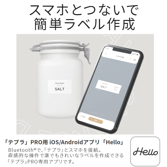 ◎スマホやタブレットPCで簡単ラベル作成 「テプラ」PRO用アプリ「Hello」と Bluetoothで接続。